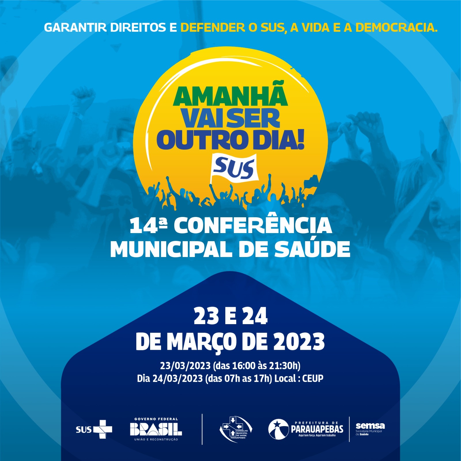 O Conselho Municipal de Saúde em parceria com a Secretaria Municipal de Saúde (Semsa) realizará nos dias 23 e 24 de março, no Centro Universitário de Parauapebas (CEUP), a 14ª Conferência Municipal de Saúde. O evento ocorrerá no dia 23, das 16h às 21h30 e no dia 24, das 7h às 17h. O Tema central da conferência deste ano é “Garantir direitos e defender o SUS, a vida e a democracia – amanhã vai ser outro dia”.