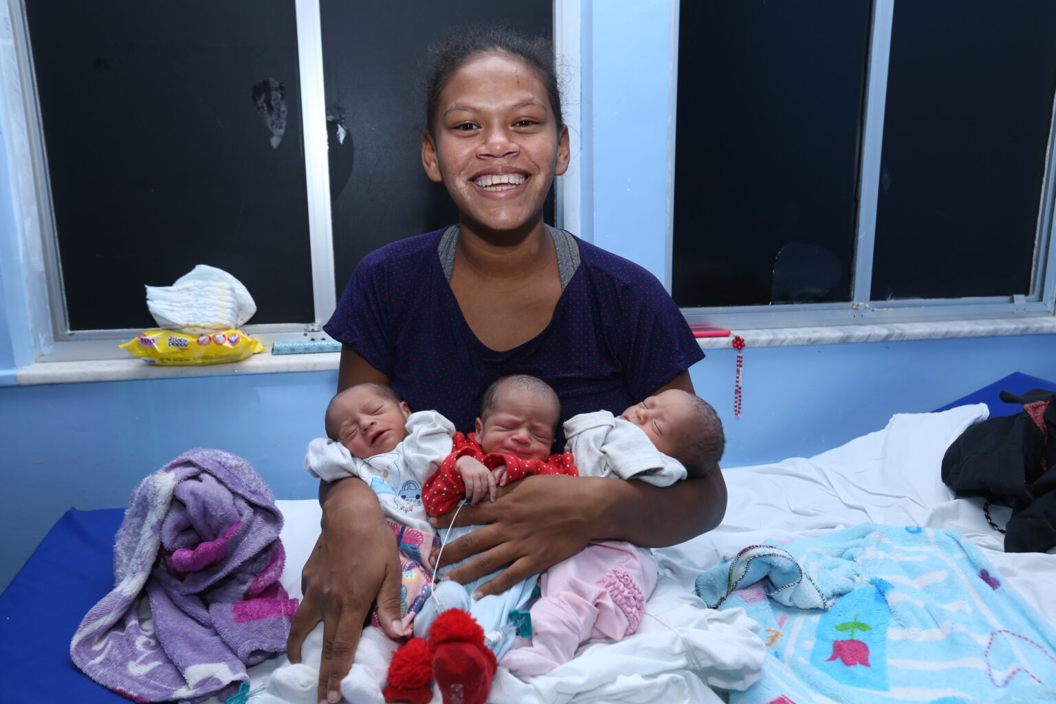 “Meu marido me acalmou. Falava pra mim que a gente ia conseguir, que íamos dar um jeito. E recebemos ajuda desde a gravidez, e aqui no hospital algumas pessoas têm nos ajudado também. Agradeço todo mundo que nos apoiou, porque coisa pra um bebê já é caro, imagina multiplicar por três”, diz emocionada, ela que já é mãe de dois meninos, um de 7 e um de 3 anos, de um outro relacionamento.