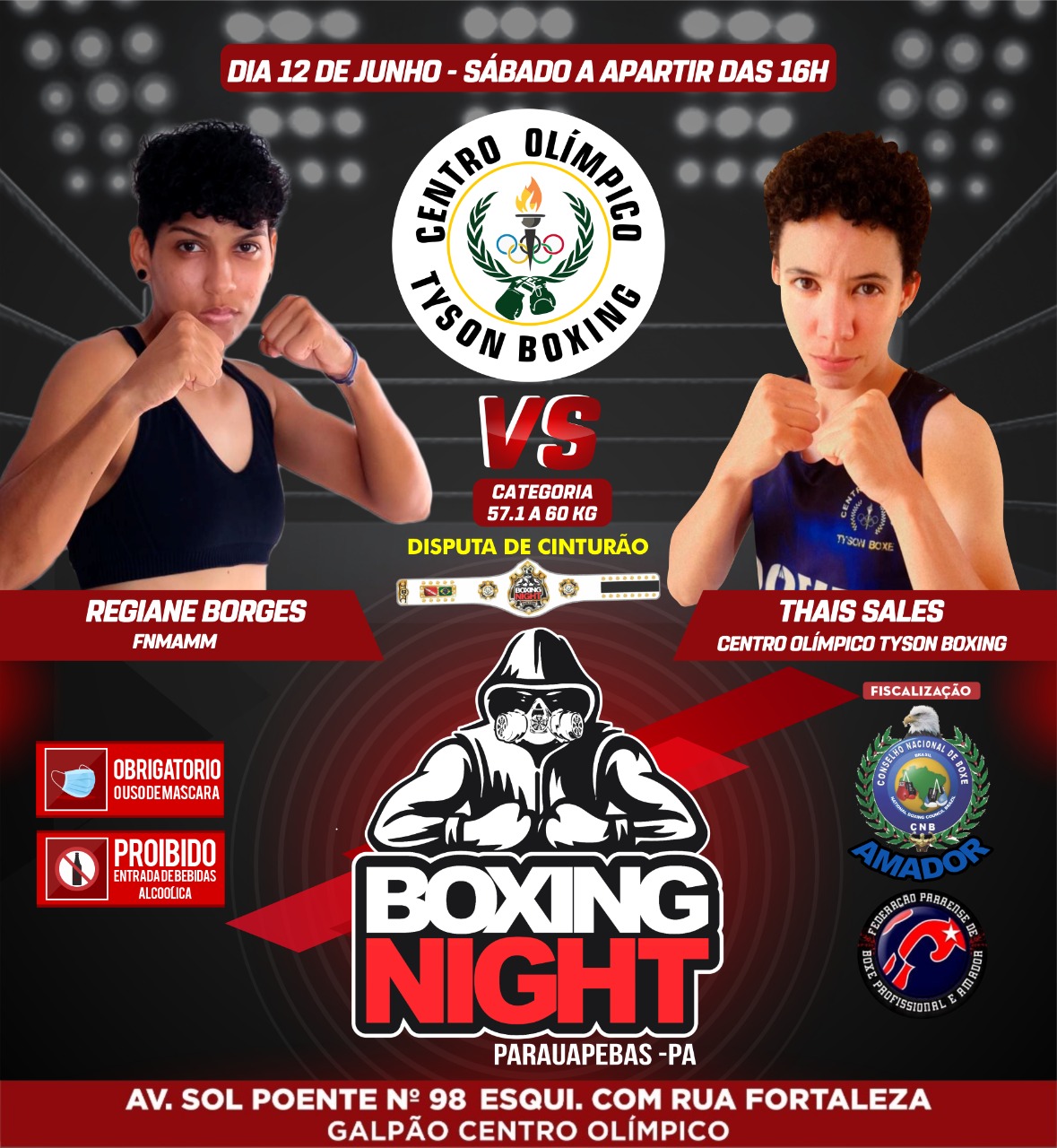 Sábado (12) de junho acontecera o grande evento Boxing Night, duas gigantes se enfrentam em uma disputa que vale cinturão, Thais Sales que lutara representando Parauapebas e o Centro Olímpico Tyson box, contra Regiane Borges, vinda de Imperatriz-MA representando FNMAMM.