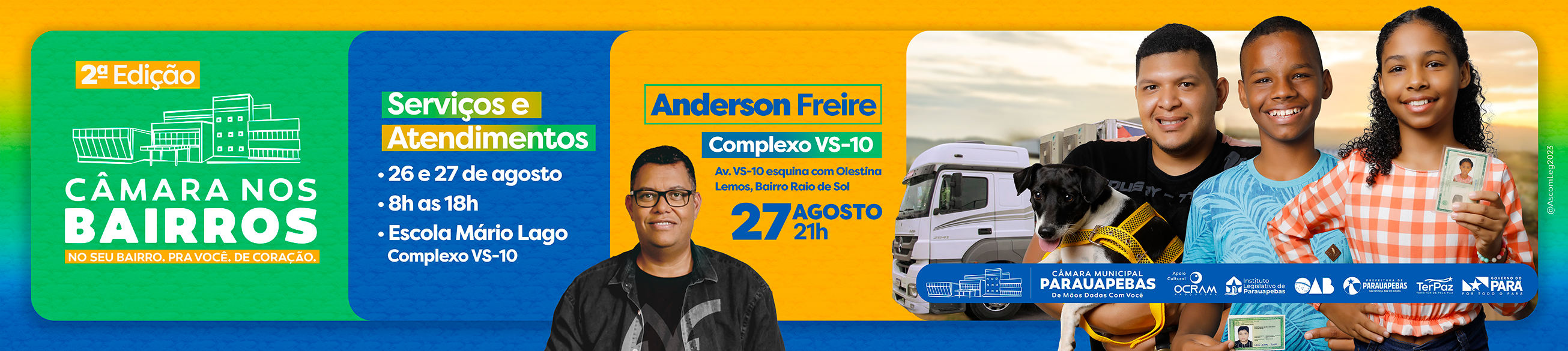 O projeto “Câmara nos Bairros” chega ao Complexo VS-10 neste final de semana, dias 26 e 27 de agosto. Nesta, que será a 2ª edição do evento, a população terá acesso a um mutirão de serviços de cidadania, saúde, educação, assistência social, cultura e lazer, além de um grande show do cantor gospel, Anderson Freire.