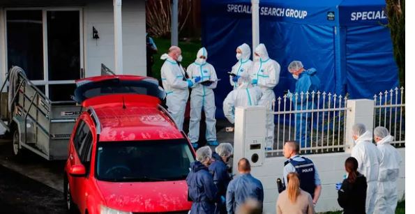 Investigadores da polícia da Nova Zelândia trabalham em Auckland, depois que corpos foram encontrados em uma mala abandonada em uma unidade de armazenamento — Foto: Dean Purcell / New Zealand Herald / via AP Photo