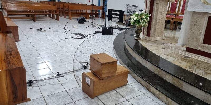 Pelo menos, dois bandidos invadiram o local e fizeram um estrago: quebraram e furtaram equipamentos de som, cortaram os fios elétricos, derrubaram as caixas de ofertórios (em busca de dinheiro), rasgaram cestas básicas e pegaram os alimentos que seriam distribuídos e, além de tudo isso, ainda defecaram no altar da igreja.
