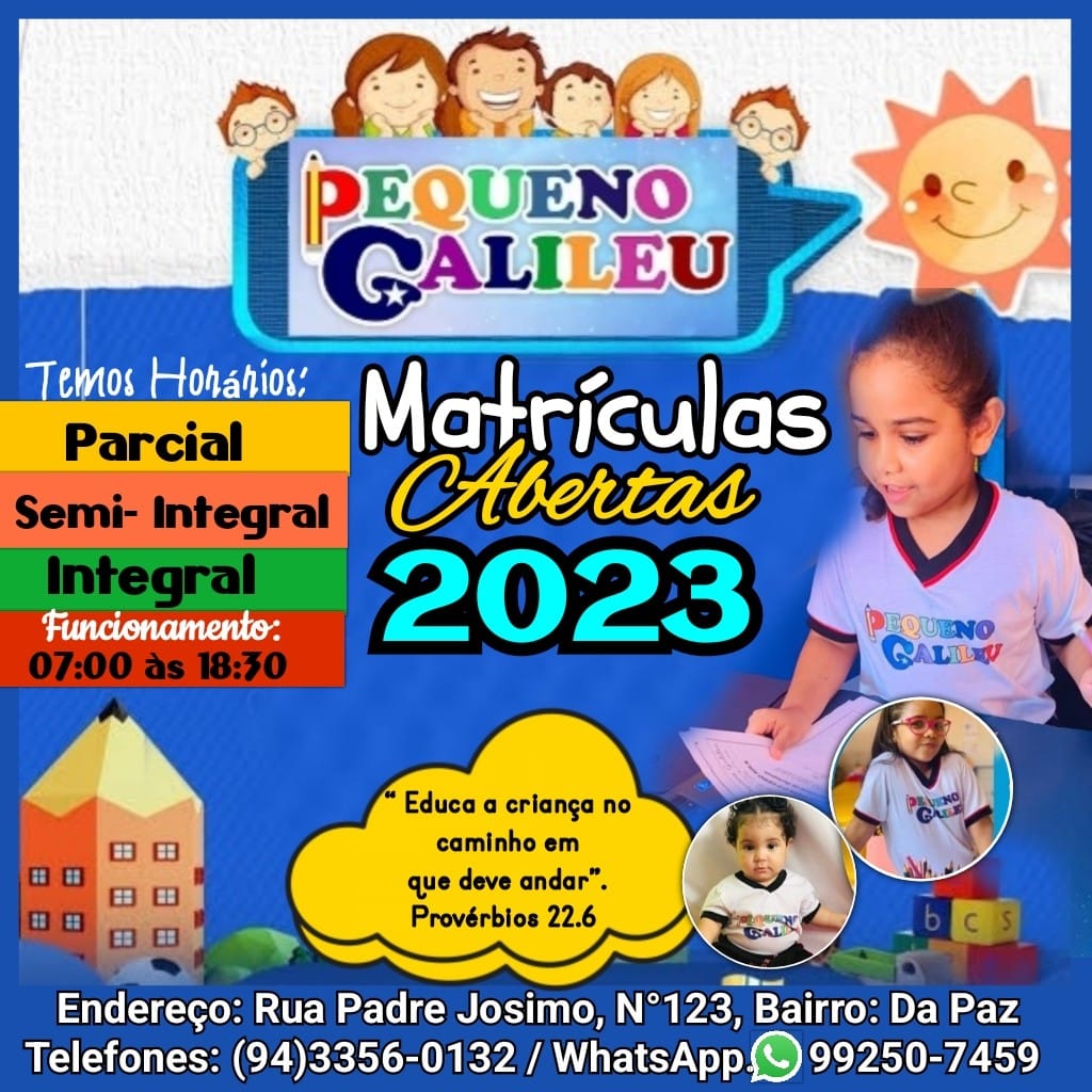 A Escola Pequeno Galileu está com matriculas abertas para 2023, a escola conta com educação em tempo integral e semi-integral com funcionamento das 7 horas às 18h30, telefone para contato (94) 99250-7459, vagas limitas.