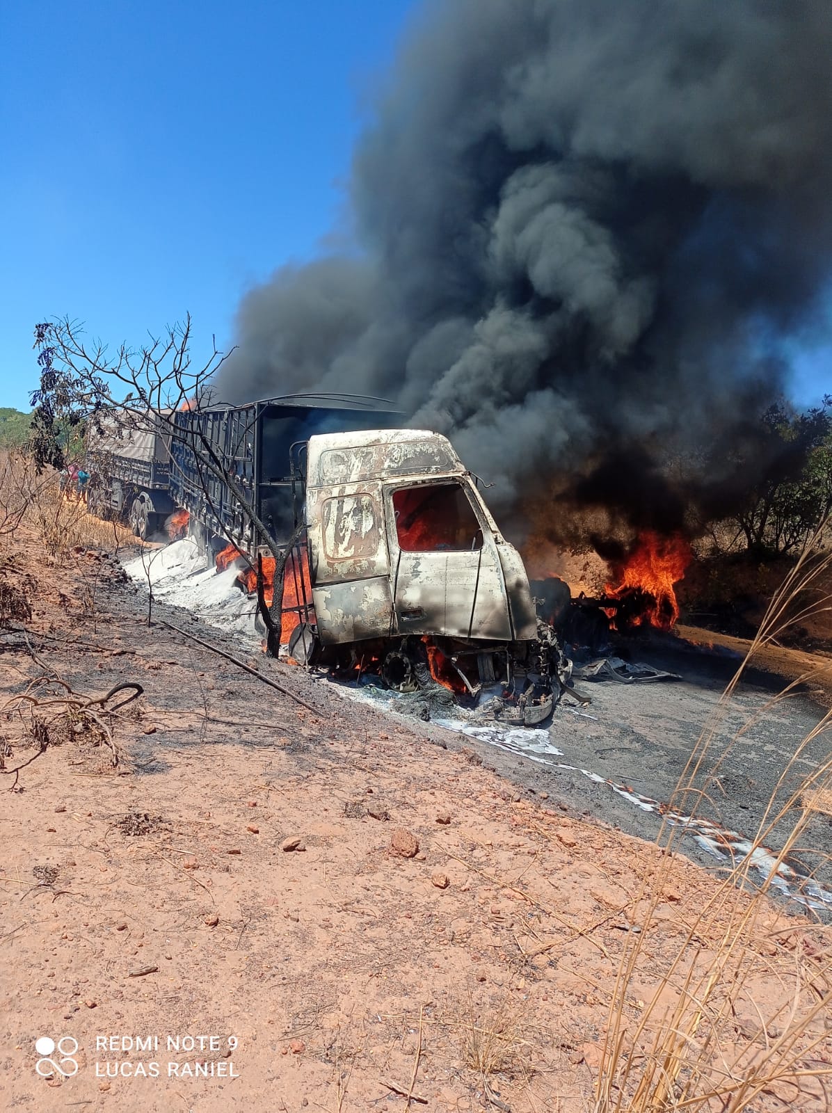 “Devido os buracos na estrada, um caminhão colidiu de frente com o outro após tentar fazer desvios. Um motorista foi socorrido para o Hospital Regional de Bertolínia após conseguir sair às pressas do veículo, e o outro morreu carbonizado na cabine do caminhão após o cinto de segurança ficar preso e devido às ferragens. Não deu tempo para o pessoal tirar ele. Não foi possível identificar os motoristas, pois ambos os caminhões pegaram fogo”, disse.