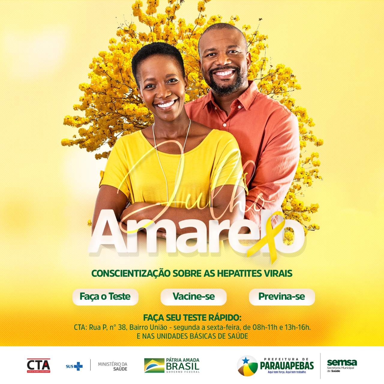 Para o Secretário de Saúde, Gilberto Laranjeiras, somente por meio de campanhas como a do Julho Amarelo é possível levar informações de forma abrangente a todos. “É um trabalho feito durante todo o ano, mas que tem no mês de julho um momento de alerta. Na campanha, chamamos a atenção para o diagnóstico, que é acessível com testes rápidos disponíveis nas 24 Unidades Básicas de Saúde, assim como no Centro de aconselhamento e testagem (CTA). O município disponibiliza gratuitamente preservativos masculinos e femininos, no segmento da prevenção, e vacinas contra hepatites A e B, em todas as salas de vacina da rede além de investir na orientação educativa de cuidados de higiene e manipulação de objetos perfurocortantes”, explica Gilberto Laranjeiras.