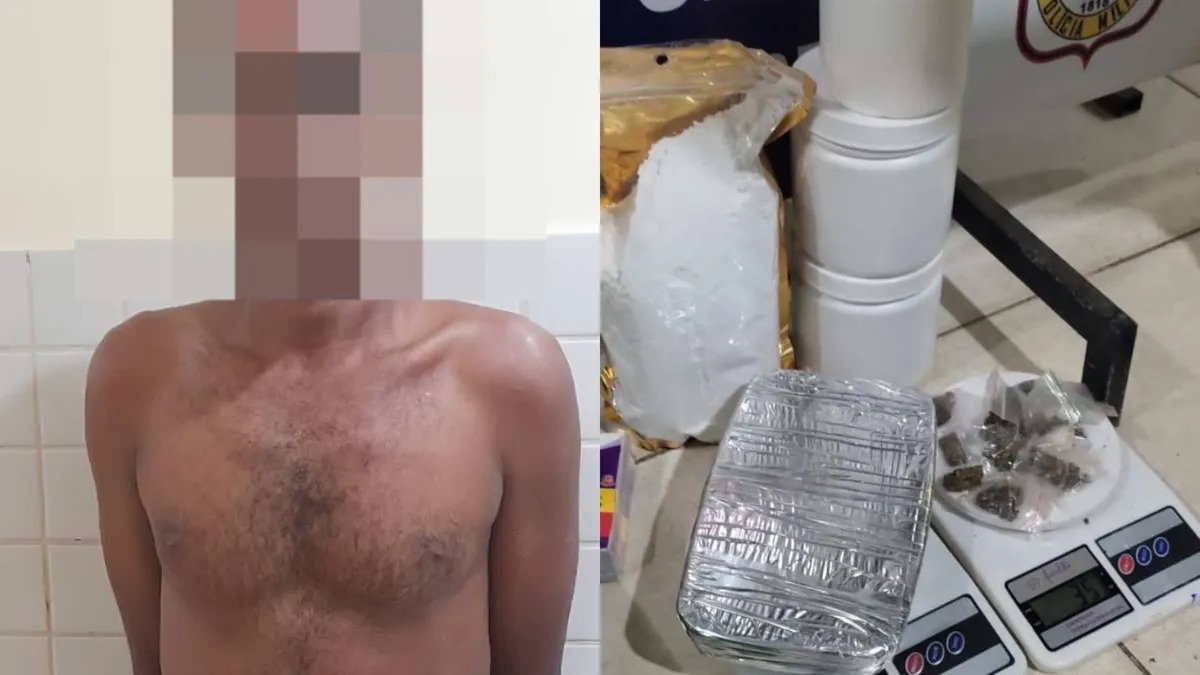 Com a captura, uma busca na mala identificou vários materiais característicos de traficantes de drogas. Entre os itens apreendidos estavam uma prensa artesanal, duas balanças, um tablete de 1.403g de pasta base, três papelotes de semente de maconha, nove papelotes de maconha prensada, dois celulares, cadernos com anotações, produtos químicos, documentos e uma faca.