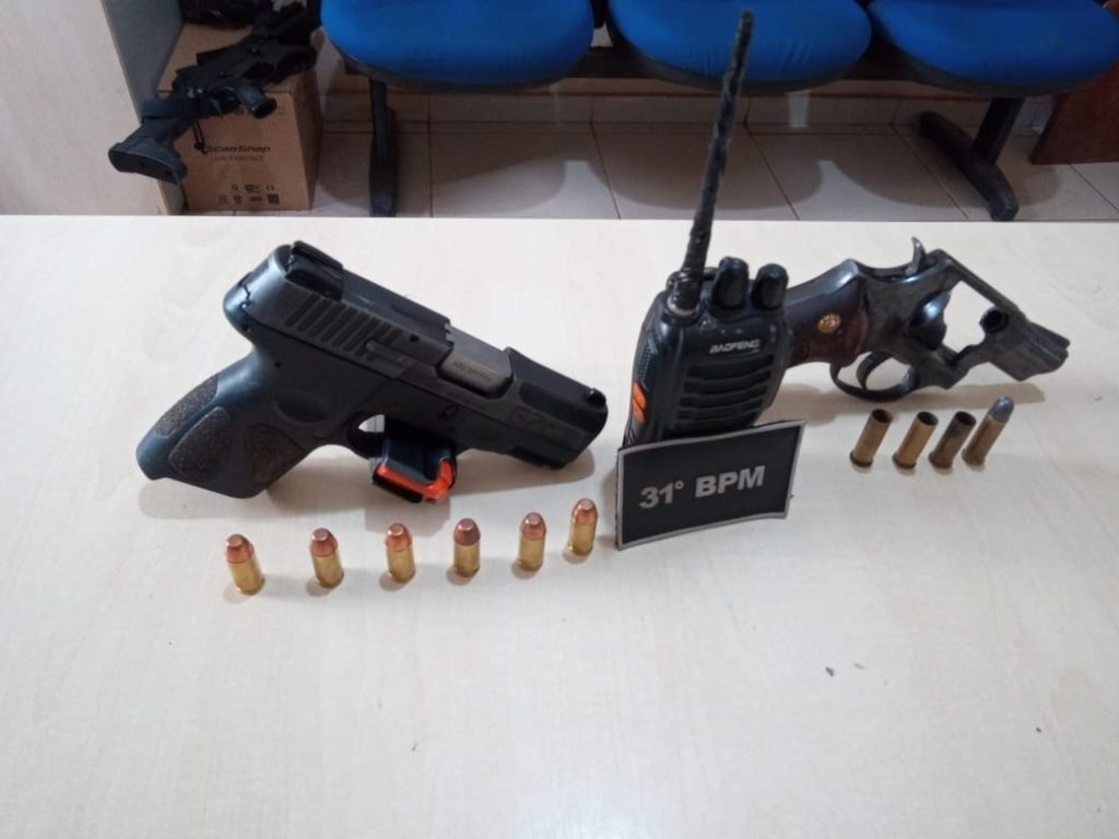 Foram apreendidos uma pistola, calibre .40, com seis munições, um revólver, calibre .38, com três munições deflagradas e uma intacta, além de um rádio comunicador. Todo material apreendido foi encaminhado para a delegacia de Polícia Civil, onde o caso foi apresentado.