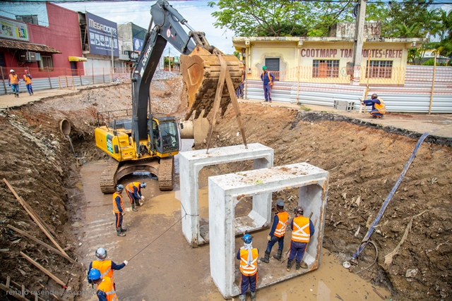 A galeria é formada por uma linha dupla de aduelas, estruturas de concreto que medem 2,5 x 2,5 metros. As águas da chuva e do Igarapé Guanabara, localizado nas proximidades do Mercado Municipal, irão escoar pela galeria até o encontro com o Igarapé Ilha do Coco, em frente ao prédio da prefeitura.