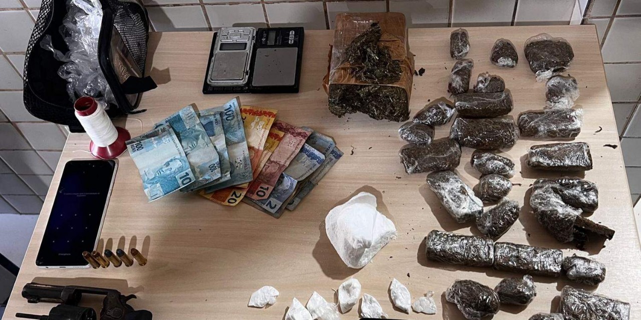 A guarnição deslocou até o local e, durante as buscas, encontrou duas sacolas. Uma continha cerca de 1,123kg do mesmo material flagrado com o suspeito, e outra com aproximadamente 288g de substância que aparentava ser cocaína. Além disso, no local também foram apreendidas uma arma de fogo cal. 38, com cinco munições intactas do mesmo calibre, duas balanças de precisão, dois aparelhos celulares e a quantia de 458 reais.