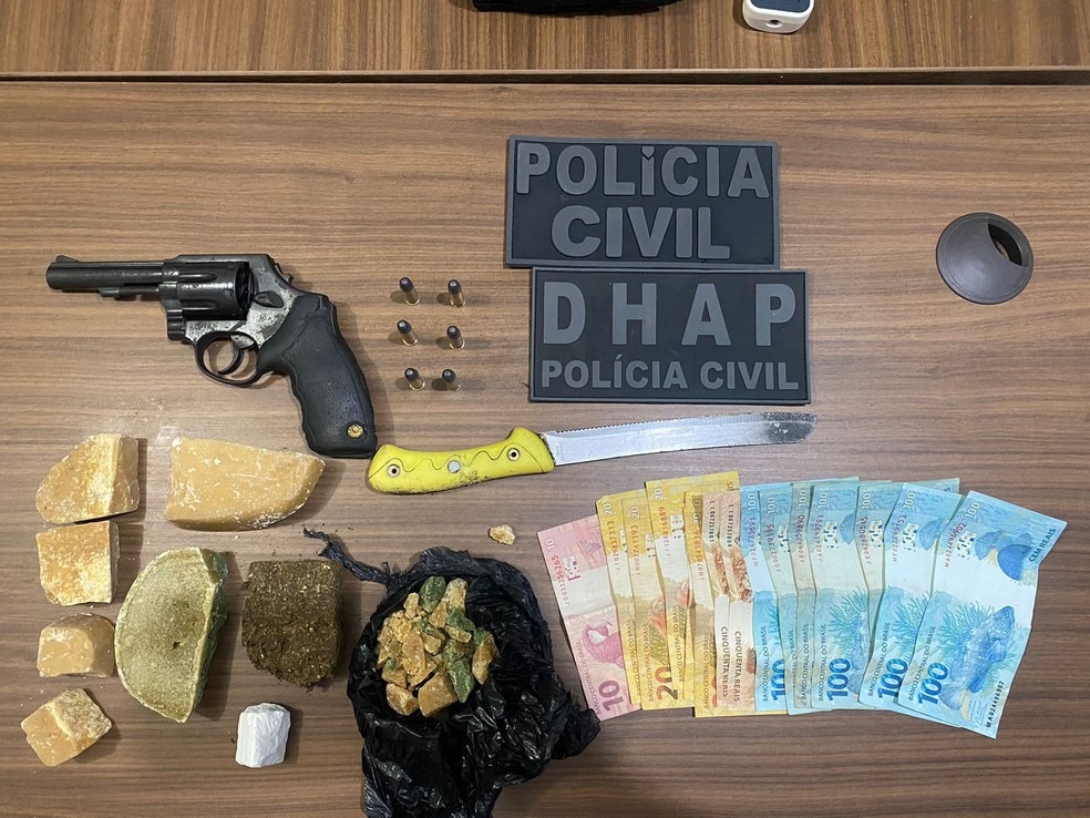 Durante a ação foram encontradas drogas, um revólver com munições, além de dinheiro e anotações referentes à dívidas de tráfico de entorpecentes.