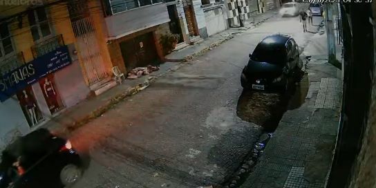 Câmeras de segurança flagraram o momento em que o condutor de um carro preto aguarda a saída de três pessoas de uma casa noturna e atira em direção a elas.