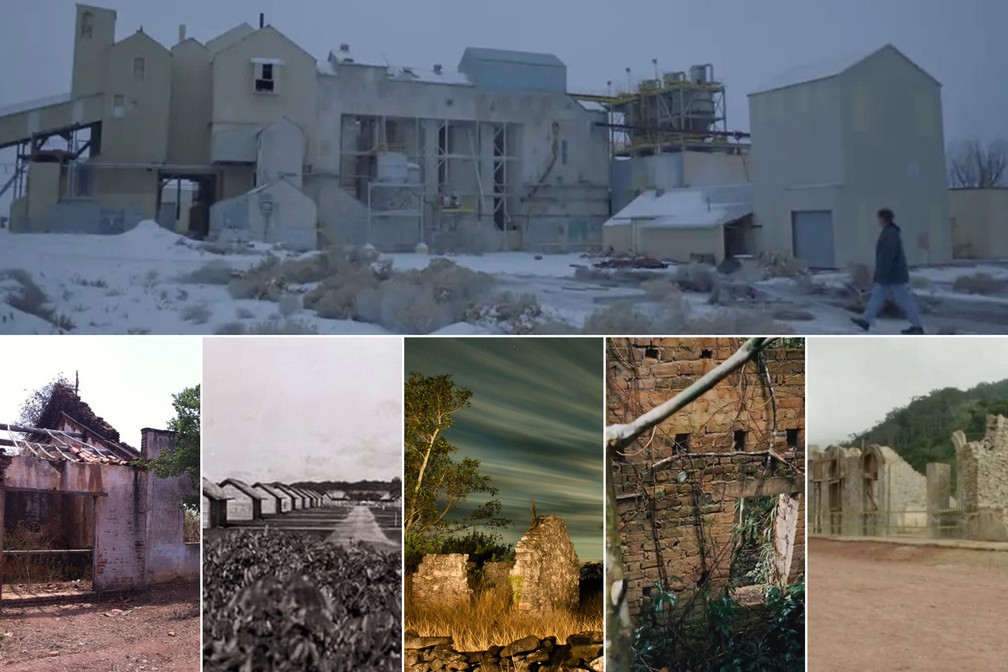 Acima, a ‘cidade-fantasma’ americana de Empire, no filme ‘Nomadland’. Abaixo, as ‘cidades-fantasma’ brasileiras de Cococi-CE, Fordlândia-PA, Igatu-BA, Velho Airão-AM e São João Marcos-RJ — Foto: André Teixeira/G1, Reprodução/Globo e Divulgação
